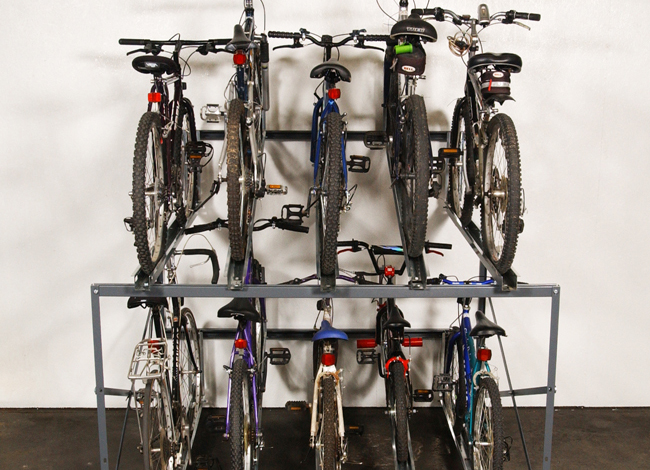 The double-tier Bike Stacker Storage Rack is an efficient way to store multiple bicycles in condominium buildings, apartments, and businesses. Store 8 - 14 bikes simultaneously!